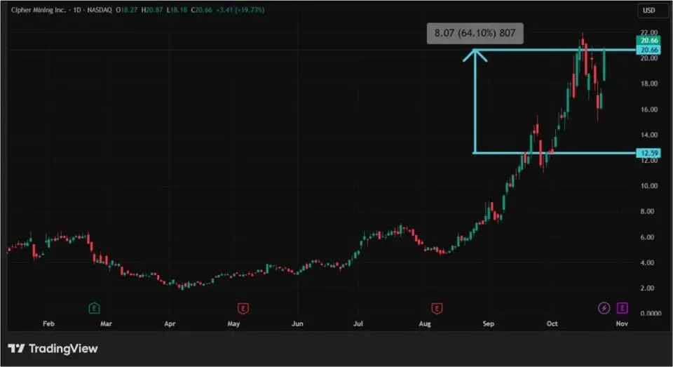 Восьмой в списке крупнейших криптокомпаний значится Cipher Mining, фокусирующаяся на майнинге и высокопроизводительных вычислениях (HPC). Ее капитализация — $8,12 млрд. Акции компании выросли в октябре 2025 года сразу на 64,1%. Одной из основных причин роста стало известие о том, что крупная трейдинговая фирма Jane Street владеет 5% акций компании, что делает ее третьим крупнейшим акционером после таких инвестиционных гигантов, как V3 Holding и Vanguard Group. Стоит отметить, что ценные бумаги CIFR в середине октября стоили дороже, достигнув нового исторического максимума в $22. Однако позже китайско-американские пертурбации относительно пошлин, привели к локальной коррекции.