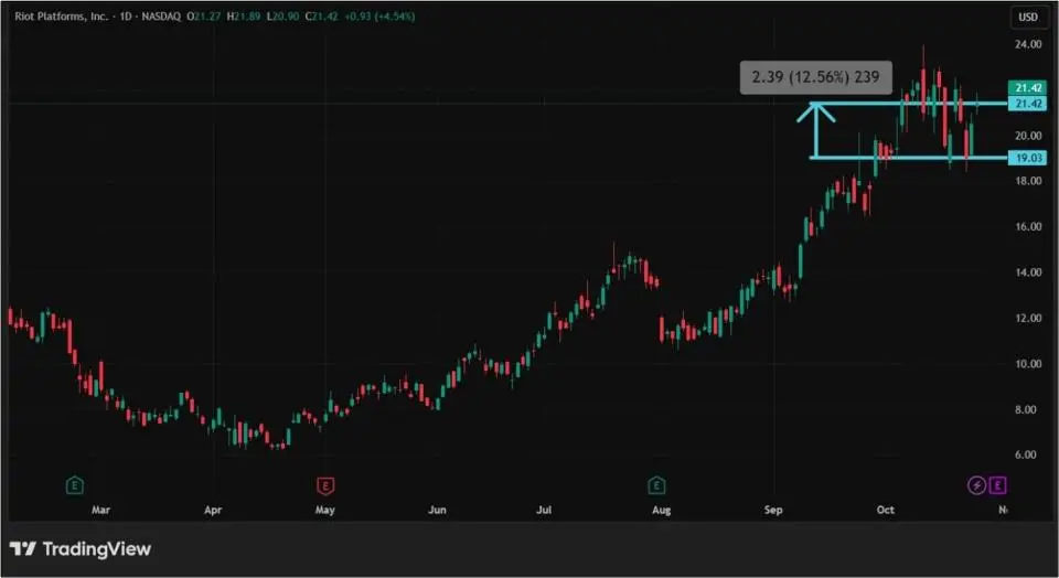 Девятое место у майнинговой компании Riot Platforms с капитализацией $7,91 млрд. В октябре 2025 года ее акции выросли на 12,56%. При этом, десятого числа они были еще дороже. Однако далее случилась коррекция, вызванная угрозами Трампа установить пошлины в 100% на китайский импорт. На этих новостях стал снижаться биткоин, а следом за ним и акции Riot Platforms, прибыль которых сильно зависит от стоимости BTC.