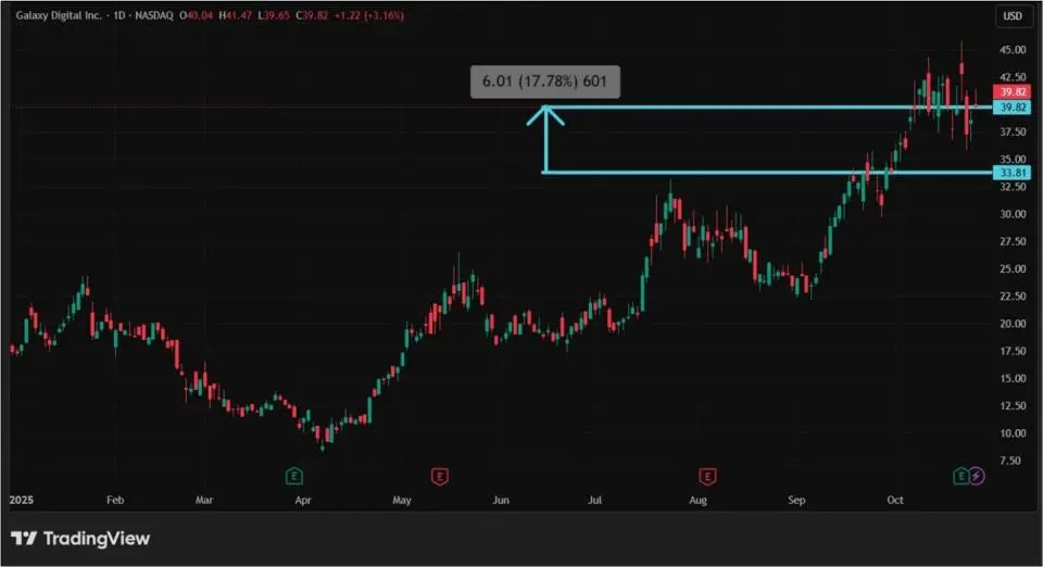 Открывает список крупнейших криптокомпаний Galaxy Digital с рыночной капитализацией $7,88 млрд. Ее деятельность в области цифровых активов обширна и включает трейдинг, банковские услуги и стейкинг. Октябрь 2025 года оказался для акций Galaxy Digital удачным — рост составил 17,78%. Среди катализаторов роста можно отметить запуск платформы по торговле криптовалютой и ценными бумагами — Galaxy One. Кроме того, компания выпустила сильный отчет за третий квартал 2025 года: прибыль составила более $0,5 млрд, объем торговли увеличился на 140% по сравнению со вторым кварталом. Несмотря на это, под конец октября произошла коррекция, основной причиной которой стало желание инвесторов зафиксировать прибыль.