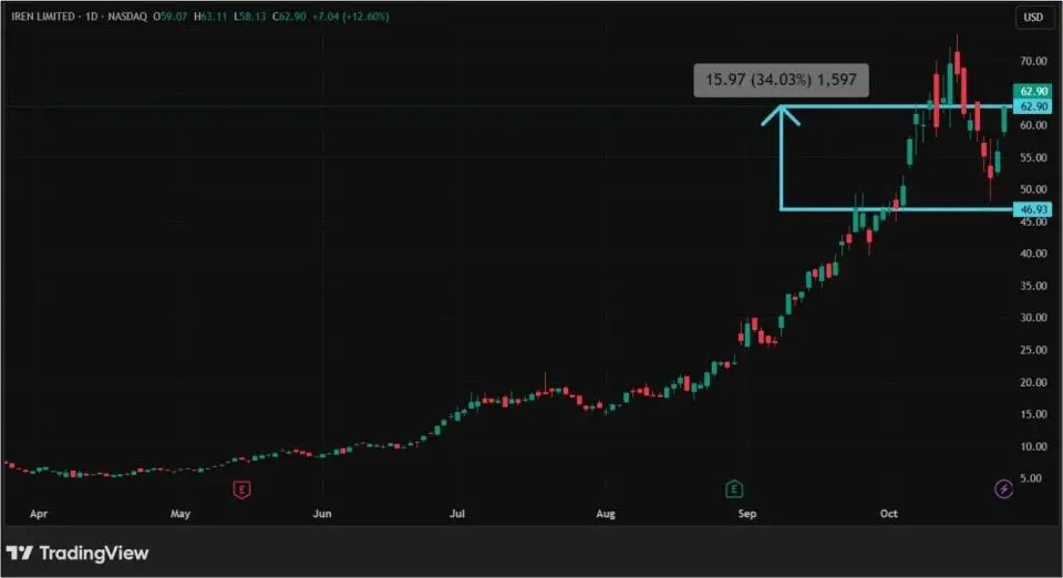 На седьмом месте по рыночной капитализации IREN с $17,1 млрд. Основная деятельность компании связана с дата-центрами, которые используются для майнинга биткоина. Первая половина октября 2025 года сложилась для акций IREN положительно — они достигли нового исторического максимума $74,15. Однако после объявления о возможных санкциях США против китайского импорта произошла резкая коррекция. Еще одним фактором, который мог привести к снижению акций IREN во второй половине октября — объявление в начале месяца о выпуске конвертируемых облигаций на сумму $875 млн. Первоначальный рост ценных бумаг был связан с заключением дополнительного партнерства с производителем чипов NVIDIA по поводу поставок графических процессоров Blackwell. Общим результатом октября для акций IREN стал рост на 34,03%.