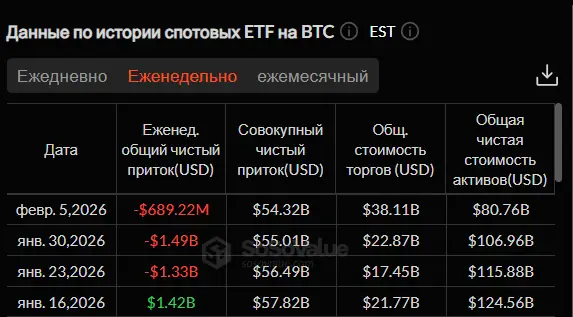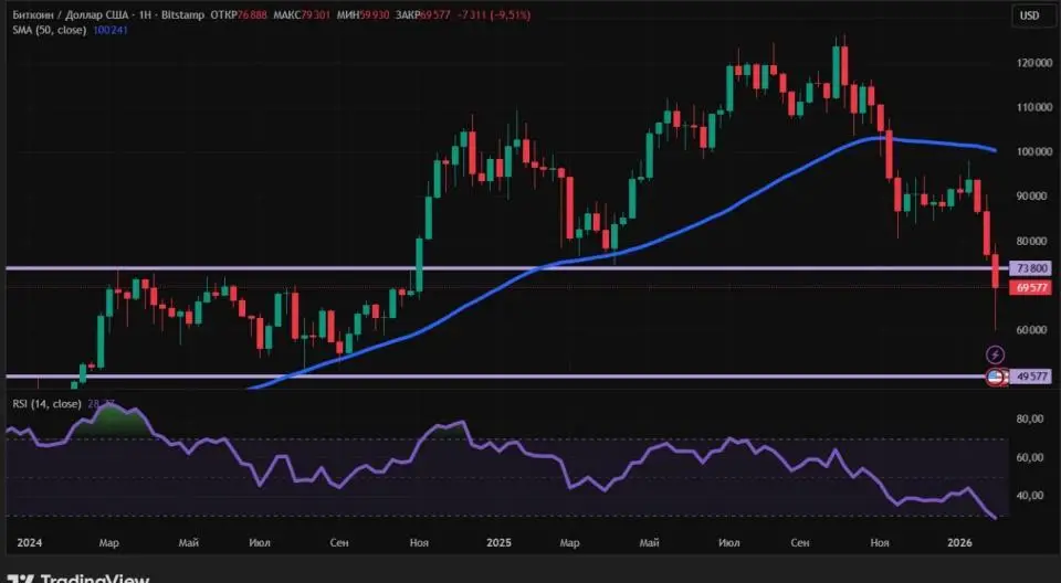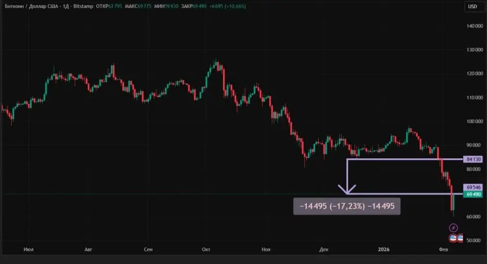 Биткоин с 30 января по 6 февраля 2026 года потерял 17,23% своей стоимости. BTC опустился ниже $70 000 впервые с ноября 2024 года. На недельном минимуме крупнейшая по капитализации криптовалюта и вовсе торговалась ниже $60 000.