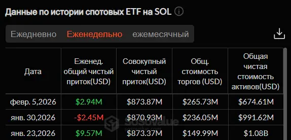 Спотовые ETF на SOL продемонстрировали скромную, но все-таки положительную динамику. Приток денежных средств за неделю оказался равен $2,94 млн. Лучшим оказался фонд компании Fidelity, Fidelity Solana Fund ETF (FSOL), который инвесторы пополнили на $5,19 млн. Худшие показатели продемонстрировал продукт Grayscale, Grayscale Solana Trust (GSOL), отток у которого составил $5,22 млн.
