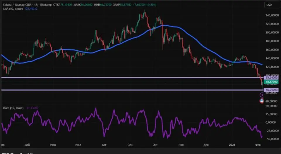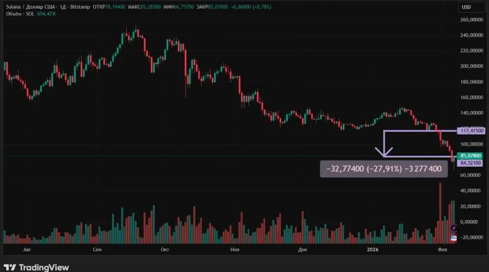 За неделю с 30 января по 6 февраля Solana подешевела на 27,91%. Цена SOL упала ниже $85 впервые за два года. Минимальная цена Solana на неделе равнялась $66,76. Падение стоимости сопровождалось увеличением волатильности и торгового объема.