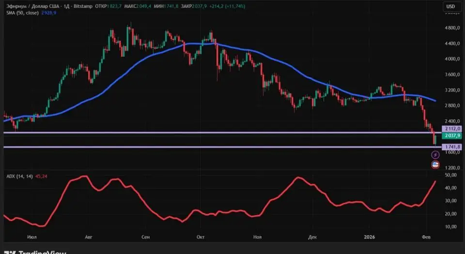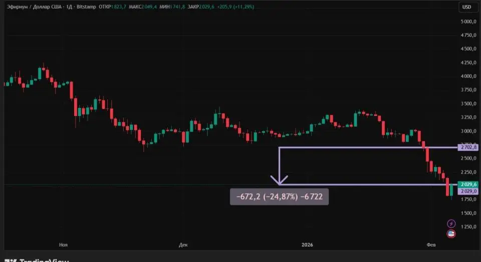 Эфир подешевел с 30 января по 6 февраля почти на 25%. Пять из семи торговых сессий закончились для ETH в минусе. Эфир опустился к отметке $2000. Последний раз ниже вторая по капитализации криптовалюта торговалась 8 мая 2025 года.