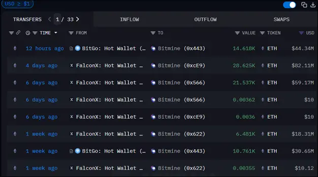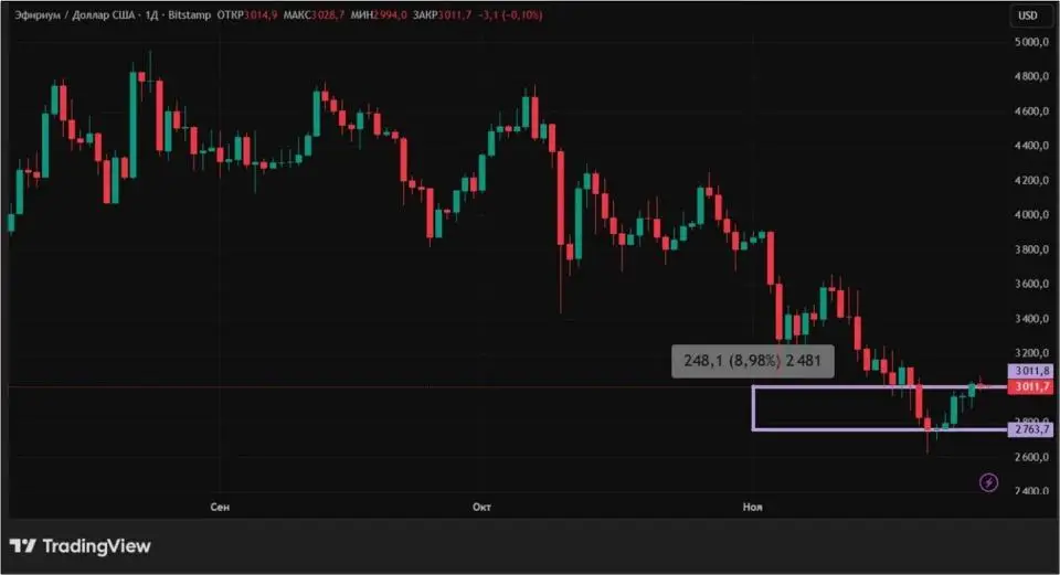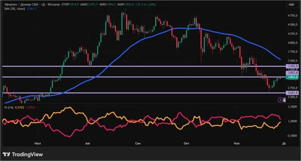 Как и в случае с биткоином, киты эфира также использовали недавнее снижение для покупок. Самым активным игроком среди приобретателей второй по капитализации криптовалюты стала компания BitMine Immersion Technologies, обладающая крупнейшим резервом ETH. По последним данным, она нарастила свои активы эфира до 3% от общего предложения монеты. Согласно информации платформы Arkham Intelligence, последнее приобретение BitMine сделала не далее как 28 ноября, купив дополнительно 14618 ETH на $44,34 млн. Такие действия не могли не подтолкнуть цену наверх.