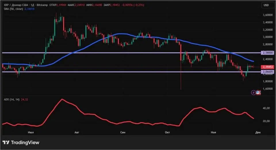 С точки зрения технического анализа, тренд у XRP, как и у биткоина с эфиром, нисходящий. Цена расположена ниже 50-дневной скользящей средней (обозначена синим цветом). Тем не менее, тренд постепенно ослабевает, о чем говорит снижение индикатора ADX до 24,32. Ближайшие уровни поддержки и сопротивления на дневном графике: $2,06 и $2,58 соответственно.