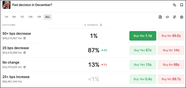 Учитывая, что последнее время настроения в криптоиндустрии относительно ставки были негативными ввиду некоторых ястребиных заявлений Пауэлла, прогноз JP Morgan подействовал воодушевляюще. Стоит отметить: на платформе предсказаний Polymarket вероятность варианта с понижением ставки ФРС США выросла в четыре раза. 20 ноября снижение на 25 базисных пунктов оценивалось в 22% вероятности, а 28 ноября — уже в 87%.