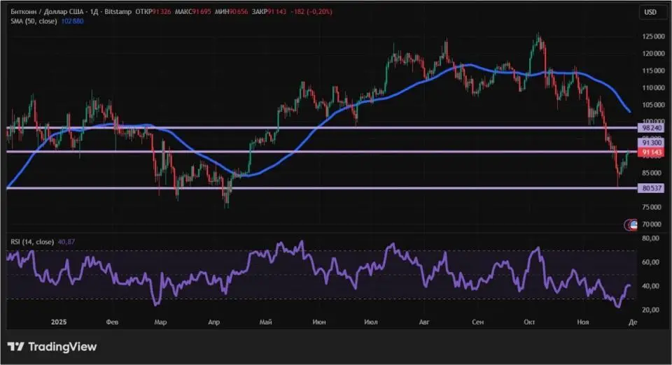 С точки зрения технического анализа, тренд биткоина остается нисходящим. Это подтверждается положением цены ниже 50-дневной скользящей средней (обозначена синим цветом). Некоторый позитивный момент для покупателей — в выходе RSI из зоны перепроданности. Однако осциллятор по-прежнему ниже значения 50, что говорит о превалировании продавцов. Сейчас для биткоина важно закрепиться выше уровня сопротивления $91 300. Если это удастся осуществить, вполне вероятен рост до следующего уровня сопротивления, $98 240. Уровнем поддержки выступает минимум ноября 2025 года — $80 537.