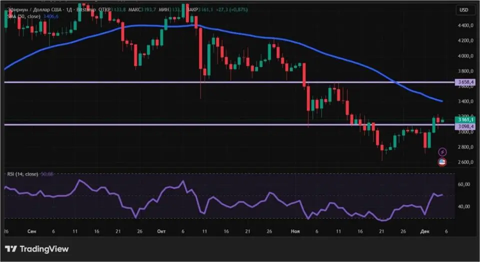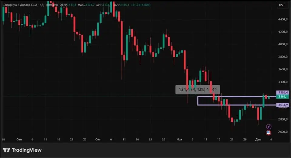 Эфир с 28 ноября по 5 декабря вырос на 4,43%. Неделя выдалась для ETH турбулентной. Сначала вторая по капитализации криптовалюта спустилась ниже $2750. Однако затем, за счет рывка более чем на 14% во вторник и среду, 2 и 3 декабря, ETH поднялся в район $3200.
