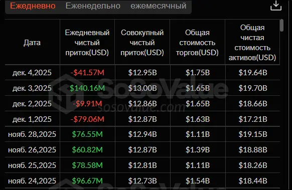Спотовые ETF на биткоин на прошедшей неделе вновь показали отрицательную динамику. Общий отток денежных средств за четыре торговые сессии составил $142,56 млн. За последние шесть недель это уже пятая, когда инвесторы предпочитают выводить деньги из спотовых биржевых фондов на BTC. Стоит, однако, учесть: по сравнению с началом ноября, когда отток превышал $1 млрд за семь дней, показатель сократился почти в девять раз. То есть все, кто хотел забрать деньги из ETF, сделали это. В начале декабря инвесторы просто предпочитают занимать выжидательную позицию.