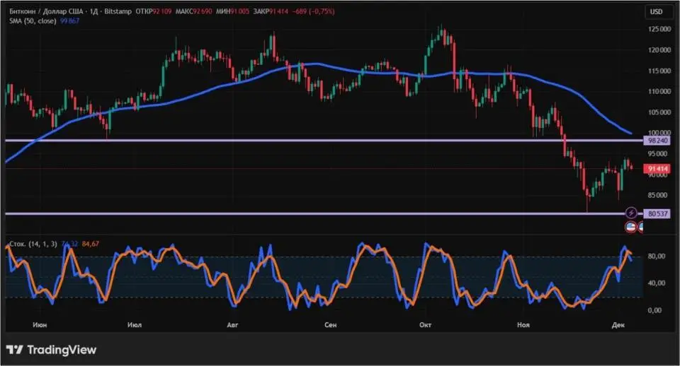 С точки зрения технического анализа, тренд биткоина все еще нисходящий. В пользу этого говорит положение цены ниже 50-дневной скользящей средней (обозначена синим цветом). Стохастический осциллятор также свидетельствует о медвежьих тенденциях: индикатор начал снижаться и опустился из зоны перекупленности. Ближайшие уровни поддержки и сопротивления на дневном графике остались неизменными с прошлой недели: $80537 и $98240 соответственно.