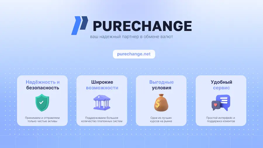 PureChange — профессиональный сервис для обмена, покупки и продажи криптовалют с поддержкой фиатных платежных систем. Обменник сочетает в себе высокий уровень безопасности, конкурентные курсы и удобный интерфейс.